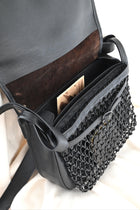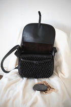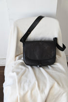 フラップ(バッグの蓋)素材:mud dye horse 奄美泥染めの馬革をベースに揉み、擦り、鉄媒染処 理、ヌ独自の味付けをしています。