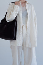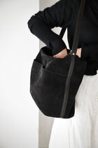 janus calfという両面使いができるカーフ素材を用いて、表面にスエー ド、持ち手や口元など強度が必要な箇所は銀面(革の表側)を用いています。外側にポケット(2ポケット)を付けた仕様です。持ち手には、無段階調整のバックルが付きます。お好みに合わせて長さ調整ができます。