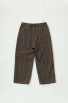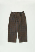 blueのラインが入った、オリジナルマスチェック柄のウールパンツ。素朴であたたかみのある表情が魅力です。程よい厚みのやわらかな生地感で保温性が高く、あたたかな穿き心地。やや丸みを帯びたシルエットながらも、上品な雰囲気があり、きれいめなスタイリングに仕上がるワイドパンツです。着用した際の落ち感も上品でとても綺麗です。オフィスカジュアルな装いとしてもおすすめのボトムス。