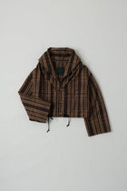 軽やかに着こなせるショート丈のアウター。見頃からつながっているフードのようなカラーが特徴的です。袖まくりや襟元のアレンジができるように、内側にタブが付いています。裾には紐が通っているのでお好みのシルエットに調整が可。