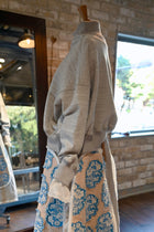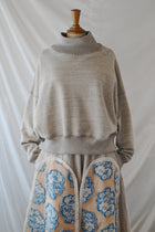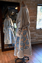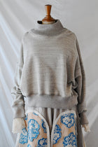変異した貴重な綿花(グリーンコットン)を糸に紡ぎ、鉄媒染で仕上げることで、独特な色合いに。くすんだ薄いブラウンを帯びたような、ムラ感のある杢調グレー。リブパーツは、コットンと毛の混紡糸で作ったオリジナルのデザインです。オーガニックコットン本来の肌触りの良さや風合いが感じられます。スウェット地ながらも滑らかでとろみのある極上の着心地をぜひご体感ください。目を惹く主役スカートにも相性◎!
