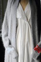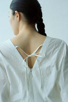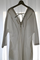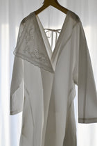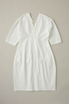 80番手糸を使用したタイプライター生地。オリジナル刺繍の襟が印象的な新型ダーツドレス。前後がVネックラインのデザイン。着る方の肩幅に合わせて、背中側の紐をお好みで結ぶ仕様です(後ろファスナー開き・釦1つあり)袖幅・アームは広く、腰回りを上品にシェイプさせ、スカートは裾にかけてやや丸みを帯びたコクーンシルエット。後ろ裾はセンタースリット入り。立体感のあるシルエットがとてもきれいな一着です。軽やかでサラリとした着心地。透け感があるため、ペチコートの着用をおすすめします。(ポケット付き・裏地なし)