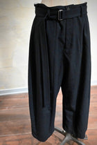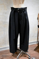 Native Village定番のダーツワイドパンツ。ダーツと接ぎ部分による、立体的なパターンが印象的な人気のデザインです。裾にかけて緩やかに細くなるコクーンシルエット。バックル付きベルトがセットになったデザイン。ウエストがゆるい時は、ベルトで簡単に締めることができます。ポケット付き。裏地なし。