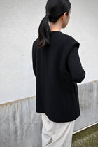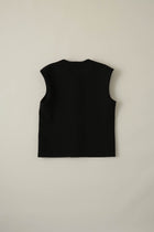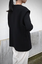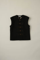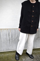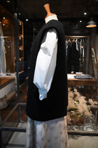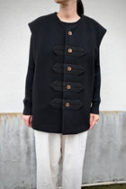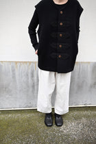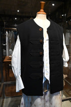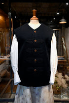 メンズライクな新型ベスト。フロントに飾りテープを施したデザイン。やや大きめのサイズ感、丈もやや長めです。裏地付きのため風を通しにくく、とても暖か。適度に厚みのあるデザインで、アウターとしても着られるベストです。ウール特有のハリやしなやかさがあります。フロントを開けて、羽織るような着こなしも雰囲気が変わっておすすめです。サイドポケット付き。