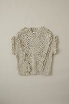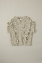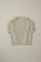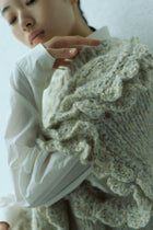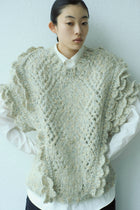 オリジナルのMIXのモヘア糸を使い、複雑な編み模様を手編みで表現したニットベスト。日本国内の熟練した編み子さんたちによって丁寧に編み上げられています。繊細ながらもゆったりと、空気を含ませたように、ふんわりと柔らかく編まれています。ダボっとしたゆとりのあるルーズシルエット。ひらひらとしたフリルの重なりが魅力的で、どの角度から見ても華やかさのある一着です。