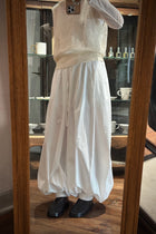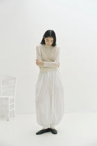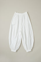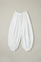 裾がつぼまったシルエットの新型ギャザーパンツ。ウエスト部分は、ゴムと紐でサイズ調節ができます。裏地なし。ポケットあり。小柄な方が着用する場合、足首で弛むようなシルエットになります。(4枚目画像...身長154cm