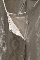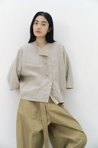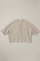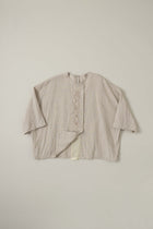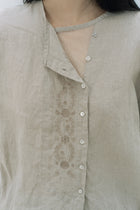 ノーカラーのワイドブラウス。フロントにオリジナルで書き上げた葉っぱの刺繍を施しました。袖丈はやや短めの7部袖くらい。袖脇下にマチ付き。前立ての重なり部分(下側)にコットンチュールの素材を使用。上部のボタンを開けた着こなしもお楽しみください。肌が透けたチュール部分がチラリと覗いて素敵です。