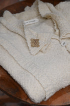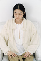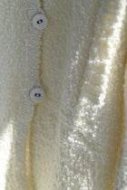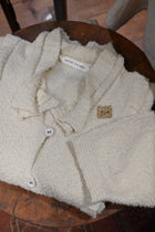 着用感はとても軽やか。もこもこ・ふわふわとした触り心地の良い素材感が魅力です。フロントのボタンは糸ループで留める仕様。小さすぎず大きすぎず、バランス良くサッと着やすいサイズ感。袖幅は、ブラウスの上から羽織れるくらいのゆとりがあります。
