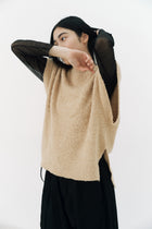 着用感はとても軽やか。もこもこ・ふわふわとした触り心地の良い素材感が魅力です。前後差のある着丈、サイドに入ったスリット。アームを広く取っているので、ブラウスやワンピースの上に重ねると、洒落感のある着こなしが楽しめます。