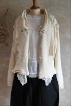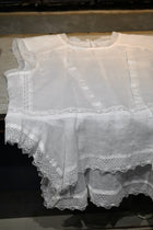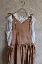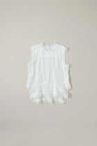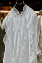 先シーズンご好評いただいた、裾のカッティンが特徴的なノースリーブのレーストップス。数種類のレースを所々に細かく贅沢にあしらったデザイン。今シーズンはレース部分全てをコットンの可憐なレースを使用し、まるでアンティークのブラウスのような凝った雰囲気に作り上げています。