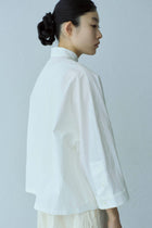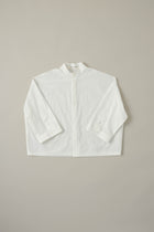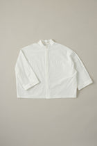 80番手糸を使用したタイプライター生地。首元を包むような立ち襟が特徴的なワイドブラウス。第一印象で清潔感のある印象を与えます。開放的な袖口とゆったりとしたサイズ感がリラックスできる一着。パンツにもスカートにも似合うデザイン。オフィスカジュアルにもおすすめのアイテムです。